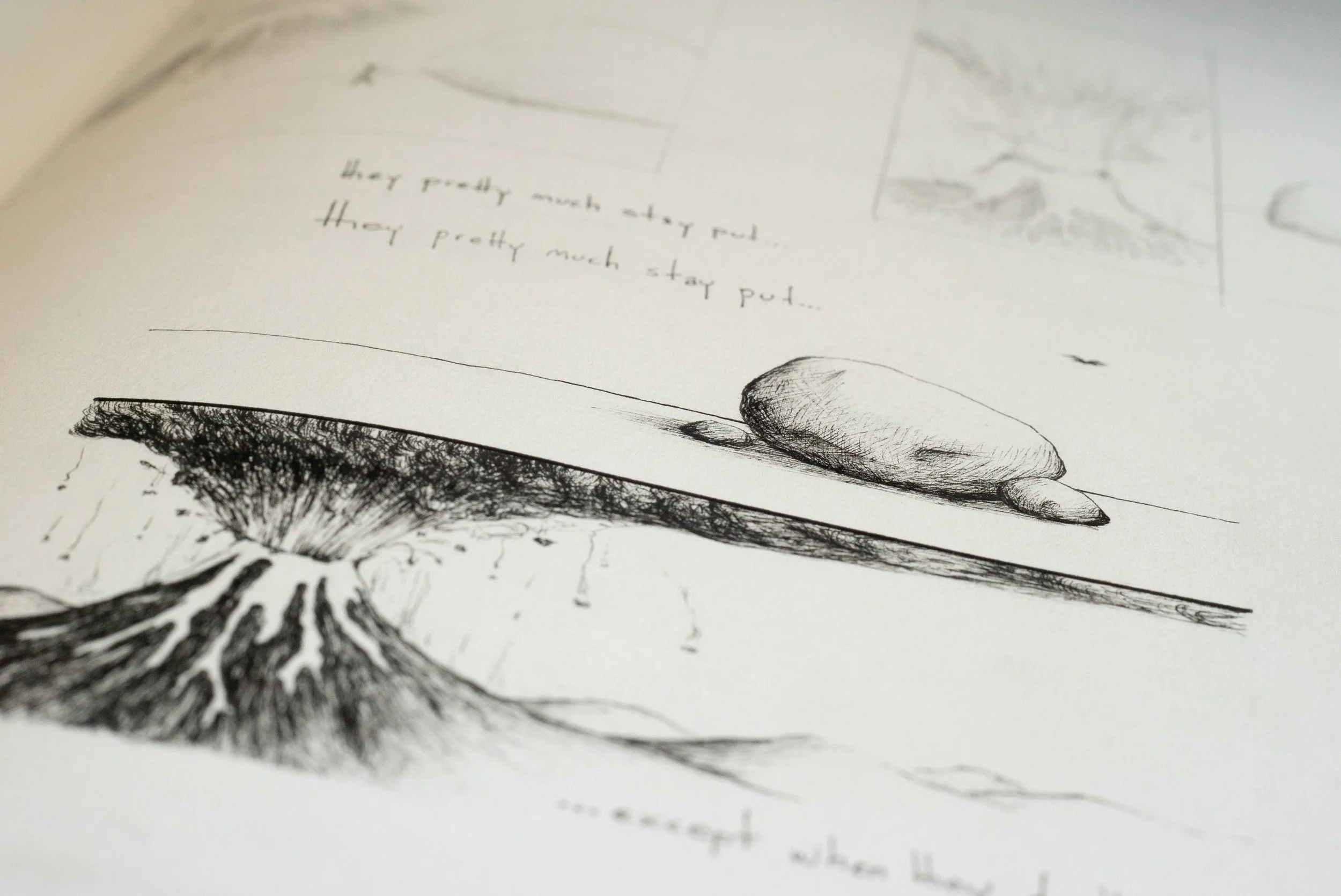 01 / sam galison working on "one true thing*" 02 / sketch of "words have specific meanings*" 03 / sketch of "rocks are inanimate objects*"