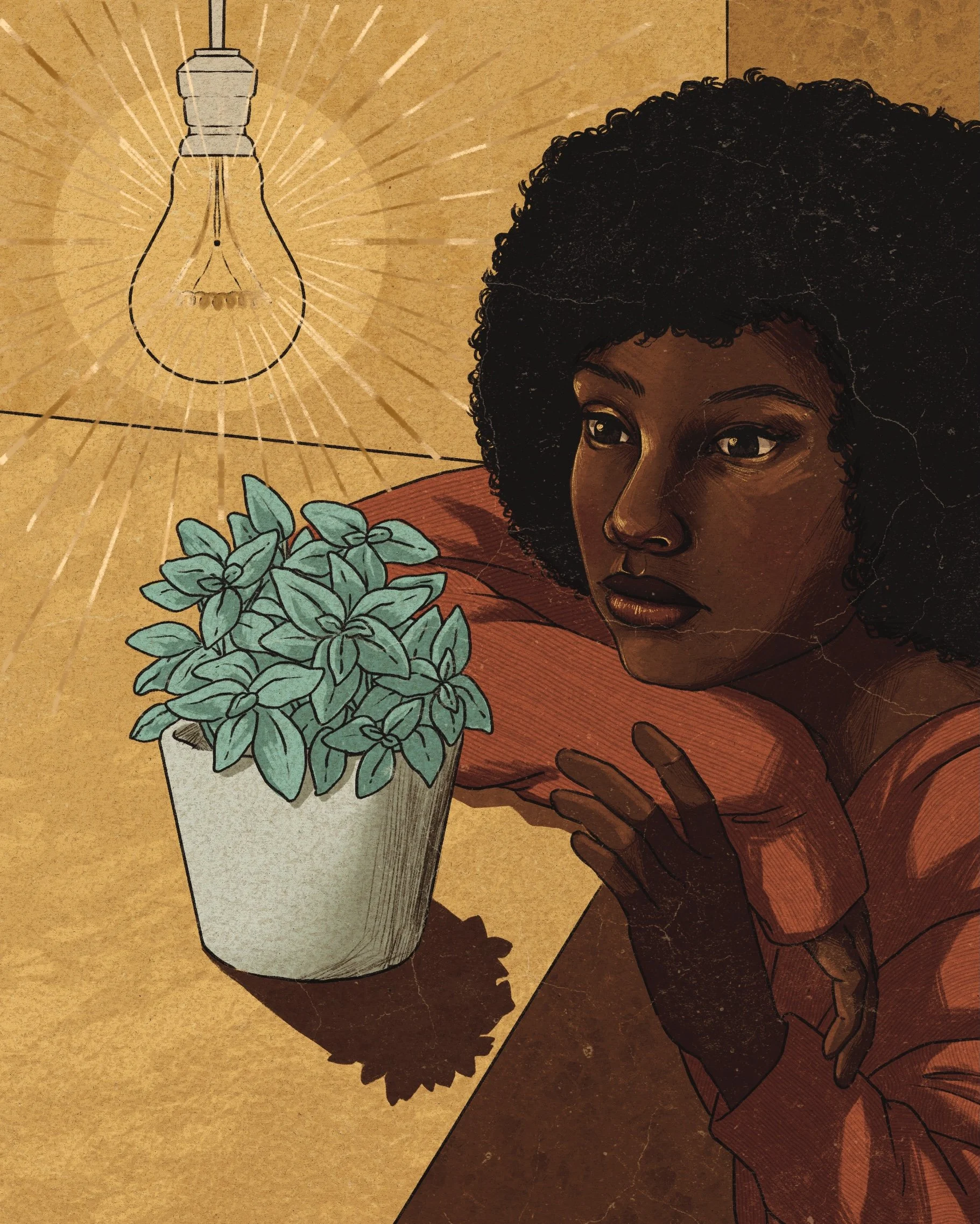 Laylie combines texture, color, and pattern to create warm and expressive portraits, pulling inspiration from nature, utilizing abstract plant, mountain, and sun motifs. For her work on The Green Gap, she translated issues at the intersection of complex social and environmental forces into rich portraits and visual stories.